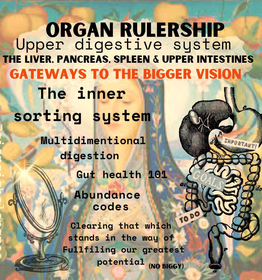 Ruling the liver, pancreas, spleen, and upper intestines, Virgo guides the âinner sorting systemâ: not just gut health, but multidimensional digestion of thoughts, habits, and the wild rainbow of daily emotions. The Digestive system is a gateway to great vision. When we clear what clogs and distracts, we make s p a c e for greater abundance, clarity, and alignment to grow & flow.