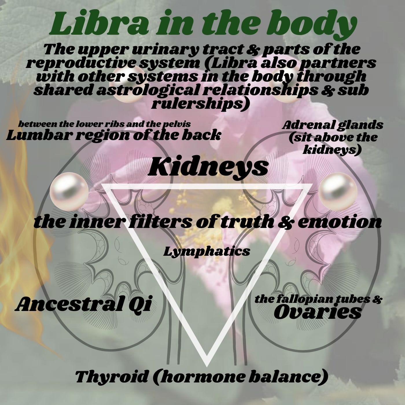 Libra predominantly is attributed to the kidney realm, the delicate organs of the water element that filter not only the fluids of the body (blood) but also the subtler waters of our emotions, most especially, fear (TCM). They are also the organs of discernment & truth.