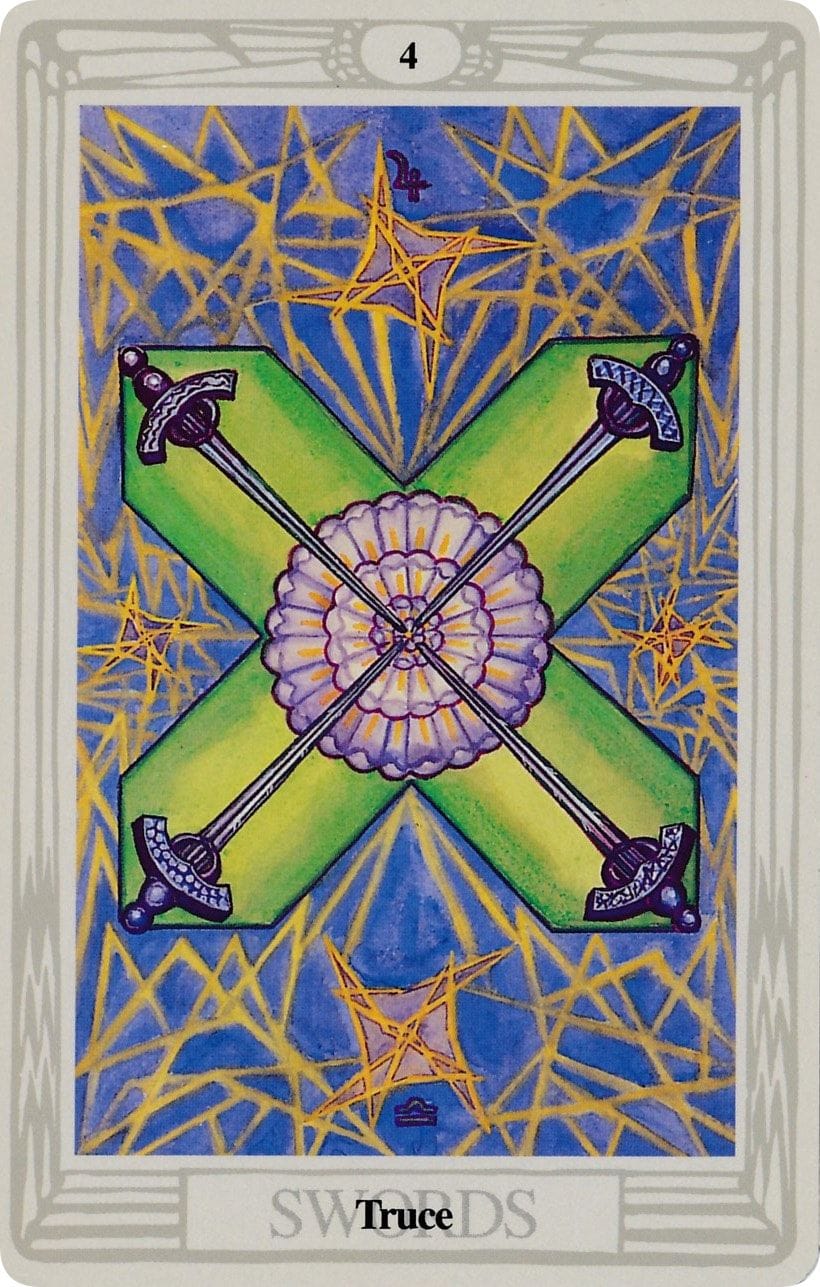 "The Four of Swords is titled Truce, a symbol of temporary mental calm, the stillness after strain. Swords form a structured cross, crowned by a rose with 49 petals, offering social harmony and inner refuge. Jupiter in Libra brings benevolence to this space, encouraging a thoughtful pause"