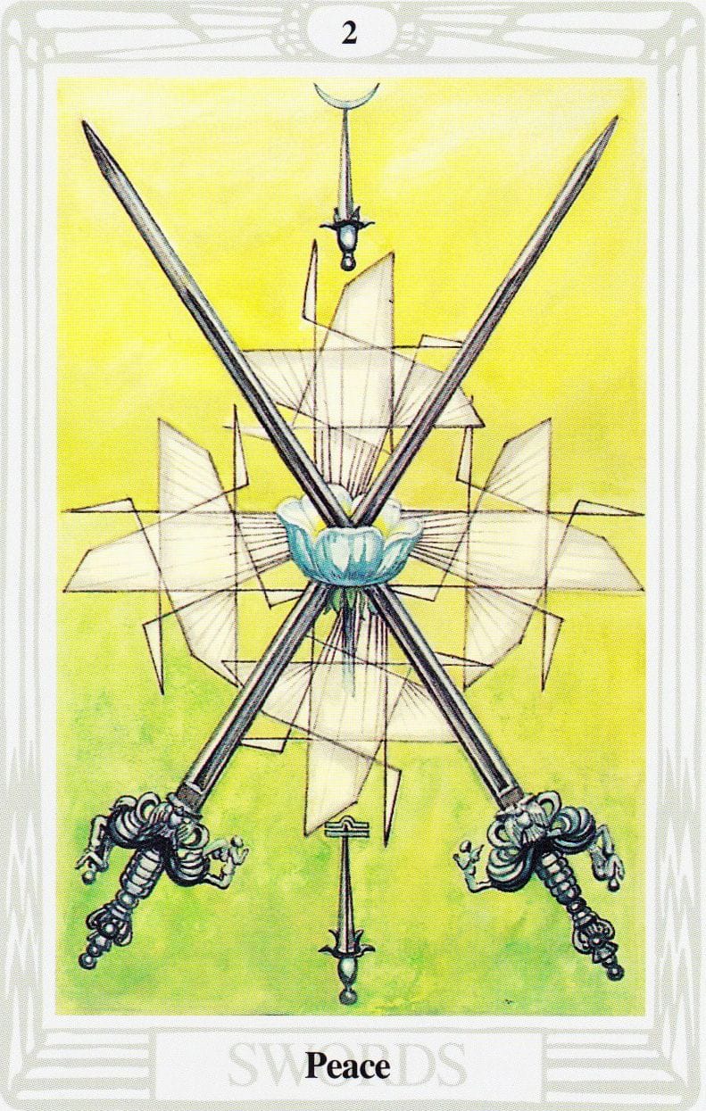 "In the Thoth deck, the Two of Swords also known as the Lord of Peace brings a serene balance to the often turbulent realm of Air, ruled by Chokmah (wisdom) on the Tree of Life. A blue rose at the centre, radiant with white rays, unites two crossed swords, symbolising a fragile yet potent peace held in equilibrium"