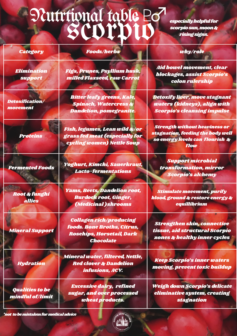 And so we arrive around the Scorpionic table ~ a feast served not of surface comfort foods, but of allies chosen for their power to cleanse, regenerate, and support the hidden processes of elimination and rebirth.