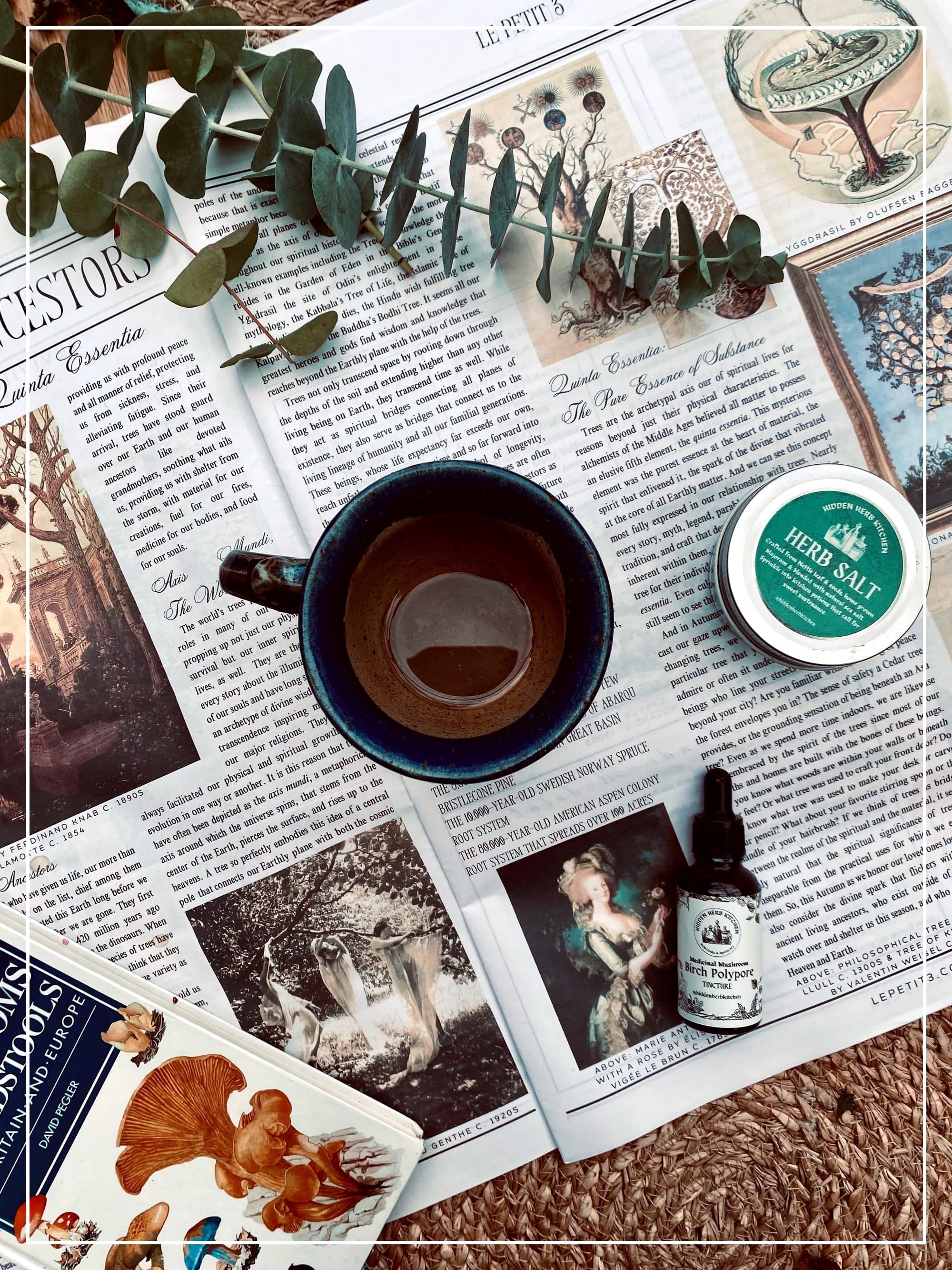 Directions: Slowly (reheat) heat the herbal infusion in a small milk pan on the stove, add in cinnamon, salt & spice bringing to a very light simmer. Turn the heat off & prepare your blender. Pour into the blender (be careful it's hot) ~ When its slightly cooled, add in your Cacao & honey, mushrooms and tahini or almond butter then blend until frothy, thickened & divinely creamy .. pour into your favourite mug, light a candle and just allow the rest to unfold, fall away...