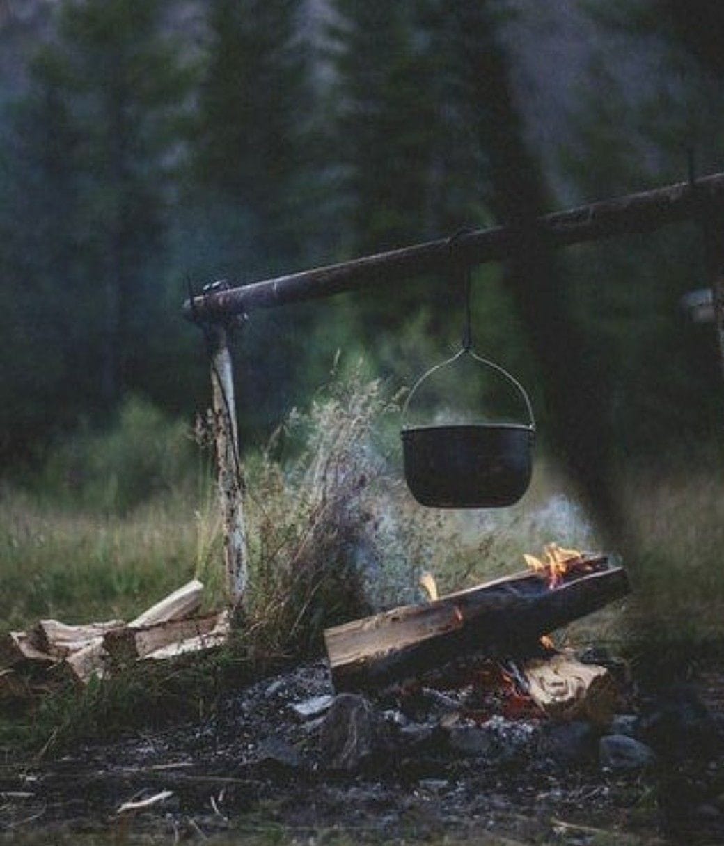 Pots hang over flames like ancient alchemical pendulums.