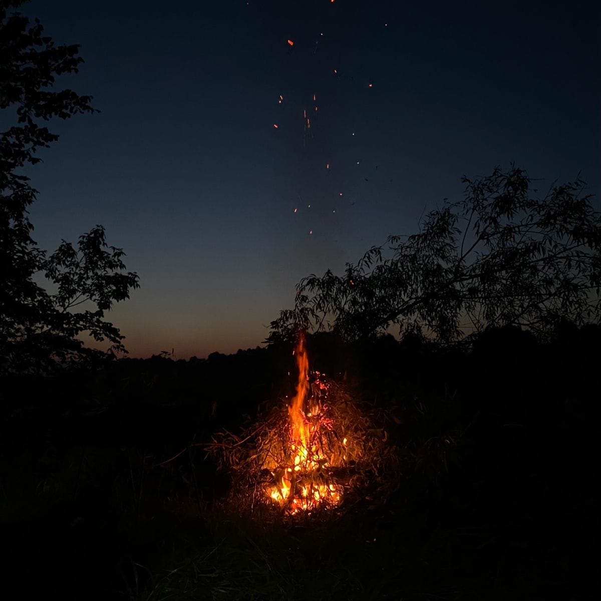 A fire crackles in a circle of stones.